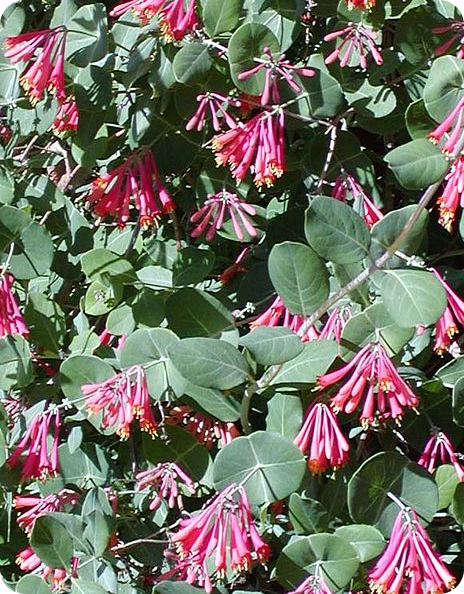 Lonicera sempervirens, also known as Coral Honeysuckle, is a twining vine with clusters of tubular, coral-red or orange flowers with yellow throats, and shiny, semi-evergreen leaves. The plant produces small, red berries in the fall.